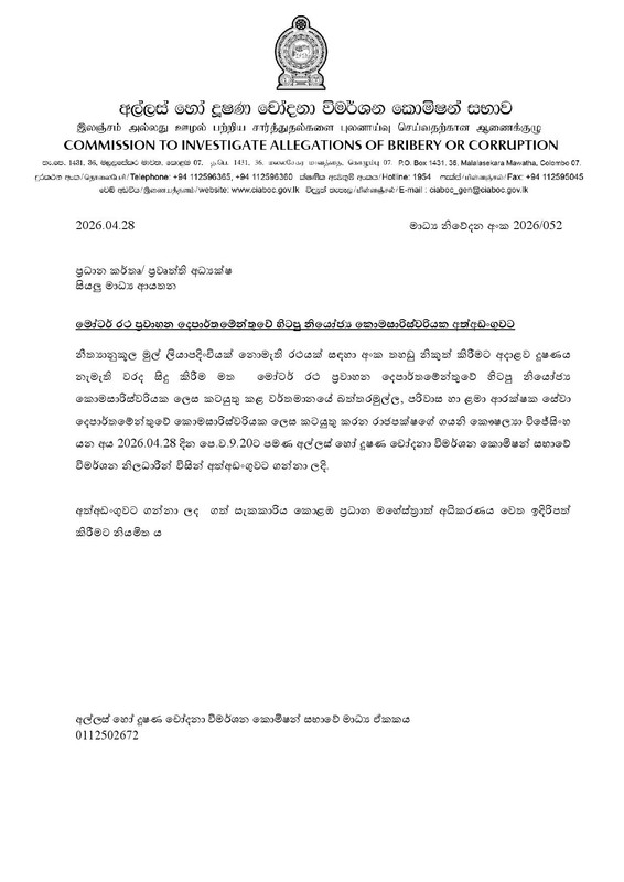 අල්ලස් හෝ දූෂණ චෝදනා විමර්ශන කොමිෂන් සභාව නිකුත් කරන ලද මාධ්ය නිවේදනය මෙතනින් බලන්න.